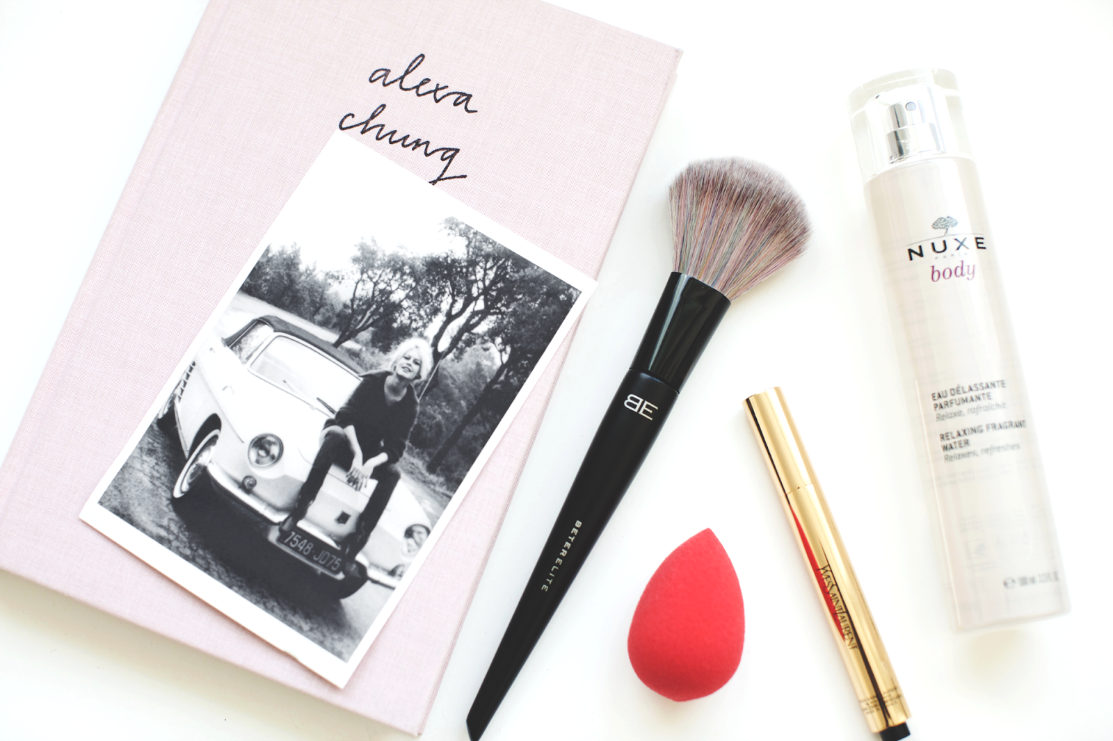 Some of the beauty items I'm loving right now. BE brushes, for their softness and dreamy application. The beauty blender, for a perfectly airbrushed finish to the skin. The YSL Touche Eclat, for a pop of brightness on your face. Nuxe fragrant water, for those upcoming spring days filled with a gorgeous fresh fragrance.