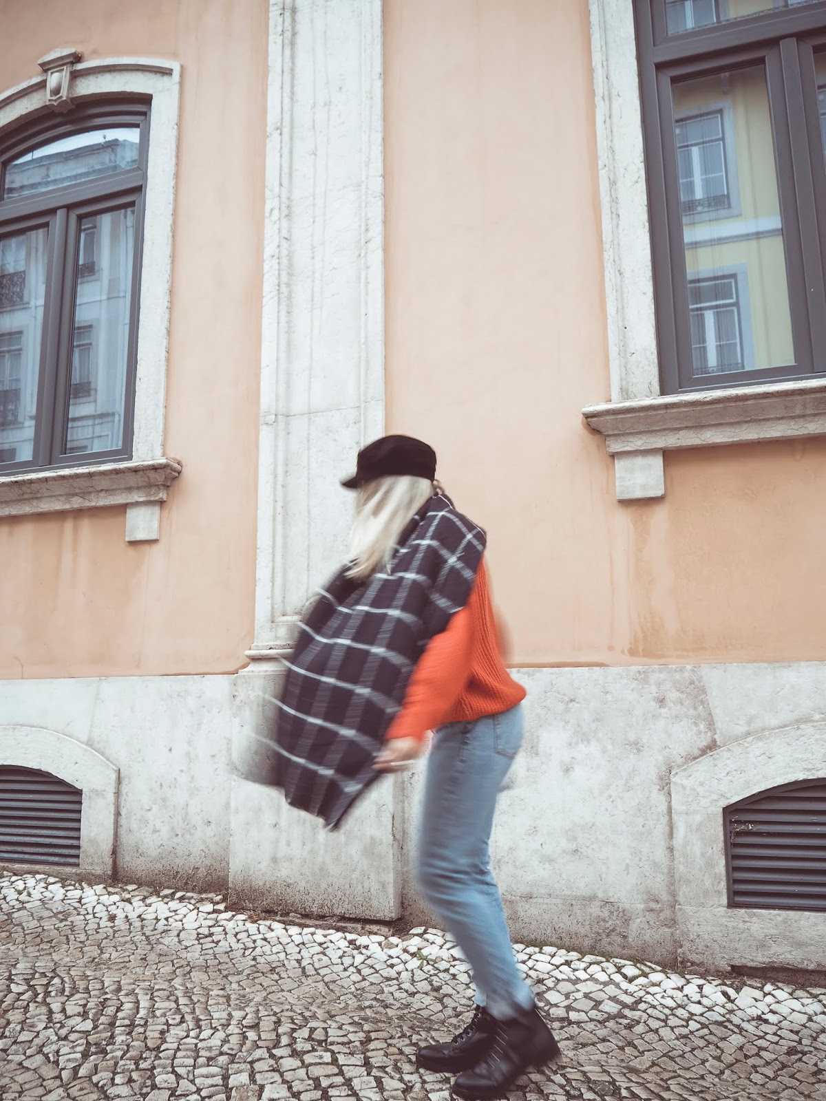 wearing Newlooks orange jumper and boots, Levis jeans, Zara scarf, Mango baker boy cap