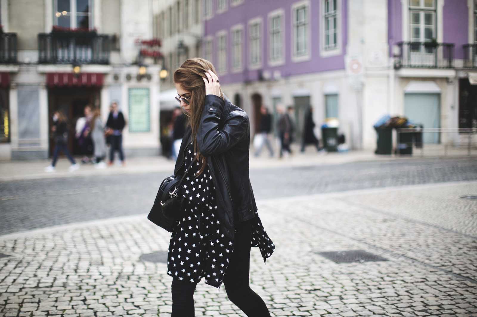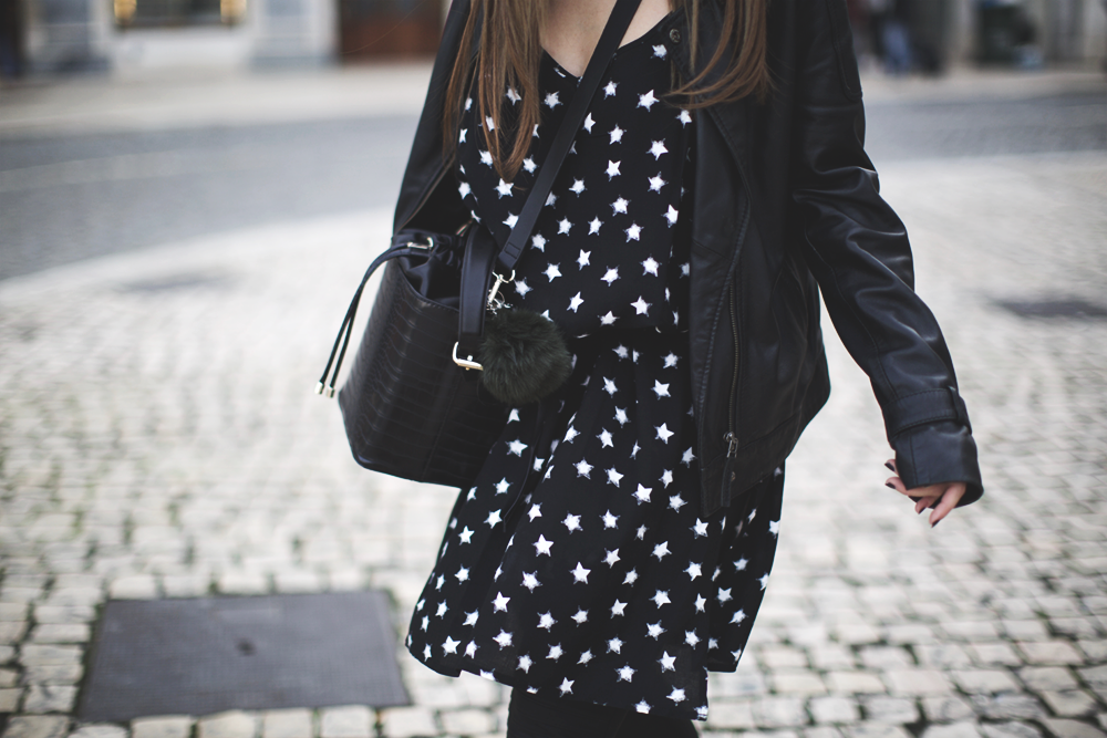 Star print dress Asos / Boots Zara / Bag Zara / Vintage Leather Jacket
